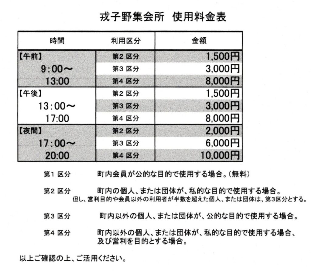 集会所の使用料は有料とする。ただし、町内会の運営のための会合及び町内会員相互の交流などに使用する場合には、無料とする。
